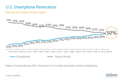 Zgodnie z raportem Nielsena na rynku USA prawie połowa badanych posiada smartfon i ich liczba rośnie z roku na rok. Wyniki badań przedstawiamy poniżej.