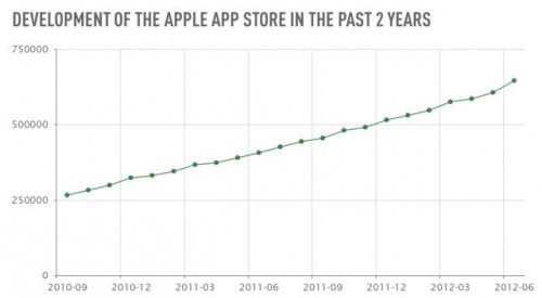 10 lipca minęły dokładnie cztery lata od momentu debiutu Apple ze swoim sklepem internetowym z aplikacjami, przeznaczonymi na swoje urządzenia mobilne – App Store. Można w nim znaleźć zarówno bezpłatne jak i płatne programy przeznaczone na platformę iOS oraz MAC. Z początku było w nim dostępnych zaledwie 500 aplikacji. Dziś ta liczba wynosi ponad 650 tys. co daje 1300 razy lepszy wynik niż w dniu otwarcia. Szacuje się, że od połowy 2008 roku całkowita liczba pobrań przekroczyła 30 miliardów. Tempo wzrostu nowych programów i gier przygotowanych pod urządzenia Apple dobrze oddaje poniższy wykres.