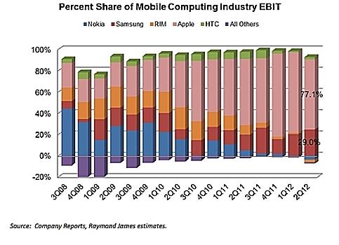 Nowe wyniki analityka Tavisa McCourta pracującego dla firmy Raymond James wyraźnie pokazują przepaść jaka dzieli zyski uzyskane przez giganta z Cupertino a resztą stawki. Te liczby są godne uwagi ze względu na fakt iż Apple miał stosunkowo niską sprzedaż swoich iPhone’ów w liczbie 26 mln sztuk. Dla porównania Samsung sprzedał w tym samym czasie prawie dwa razy więcej, bo 50 mln smartphonów.