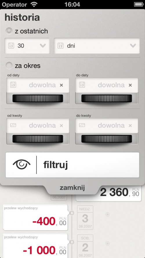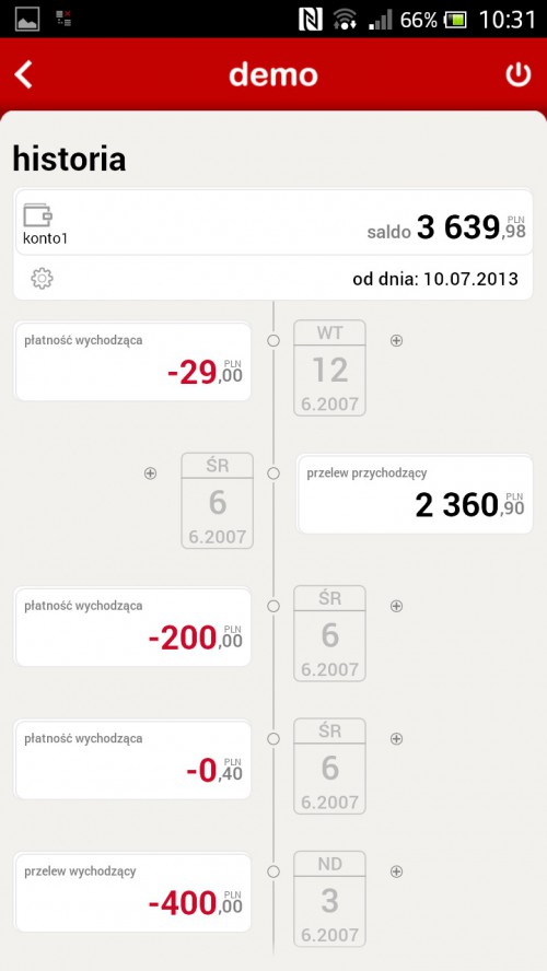 Historia operacji na rachunkach przedstawiona jest za pomocą osi czasu. To rozwiązanie w łatwy sposób wizualizuje klientowi stan jego konta oraz etapy poszczególnych transakcji. Każdą z nich można dodatkowo „rozwinąć” w celu poznania szczegółów operacji. Kwoty są ułożone chronologiczne i oznaczone kolorami, odpowiadają im również poszczególne strony osi.