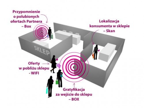 - Aplikacja oparta jest o unikalny system lokalizowania konsumenta podczas wejścia do sklepu, wpływania na jego zachowanie i decyzje zakupowe w realnym świecie – decyzje zakupowe podejmowane są bezpośrednio w miejscu zakupu.