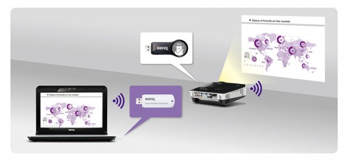W komplecie z projektorem użytkownik dostaje moduł Wi-Fi pozwalający na bezprzewodową komunikacje z projektorem i bezprzewodowe wyświetlanie treści.