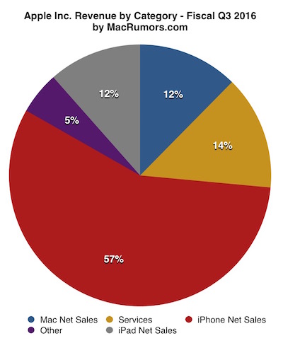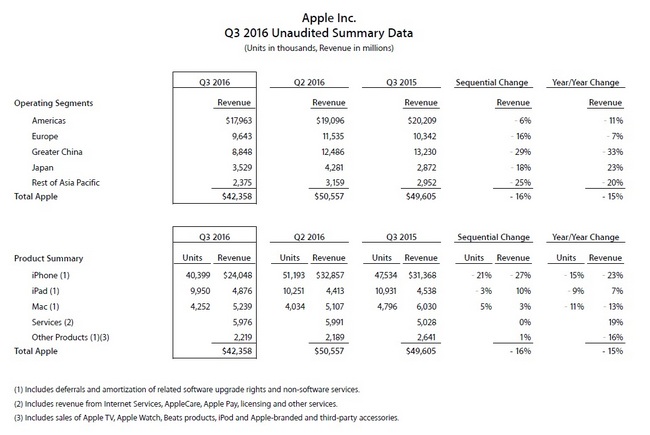 Apple sprzedało w omawianym okresie 40,4 mln iPhone (- 15% w porównaniu do 3Q 2015 r.), 9,95 mln iPadów (- 9% r.d.r.), 4.25 mln mln komputerów Mac (- 11%. r.d.r.).