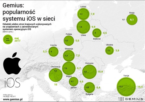 W trzech spośród 14 analizowanych krajów odsetek odsłon na urządzeniach z iOS osiągnął w maju 2017 roku wynik dwucyfrowy (źródło: gemiusPrism). Rekordzistą jest Turcja, gdzie co piątą (19,4 proc.) odsłonę krajowych stron WWW wykonano na urządzeniu z systemem Apple’a. Wysokie wyniki odnotowano także w Rumunii (10,9 proc.) i Chorwacji (10 proc.). W maju 2017 roku najmniej popularny iOS był na Ukrainie (3,9 proc. odsłon).