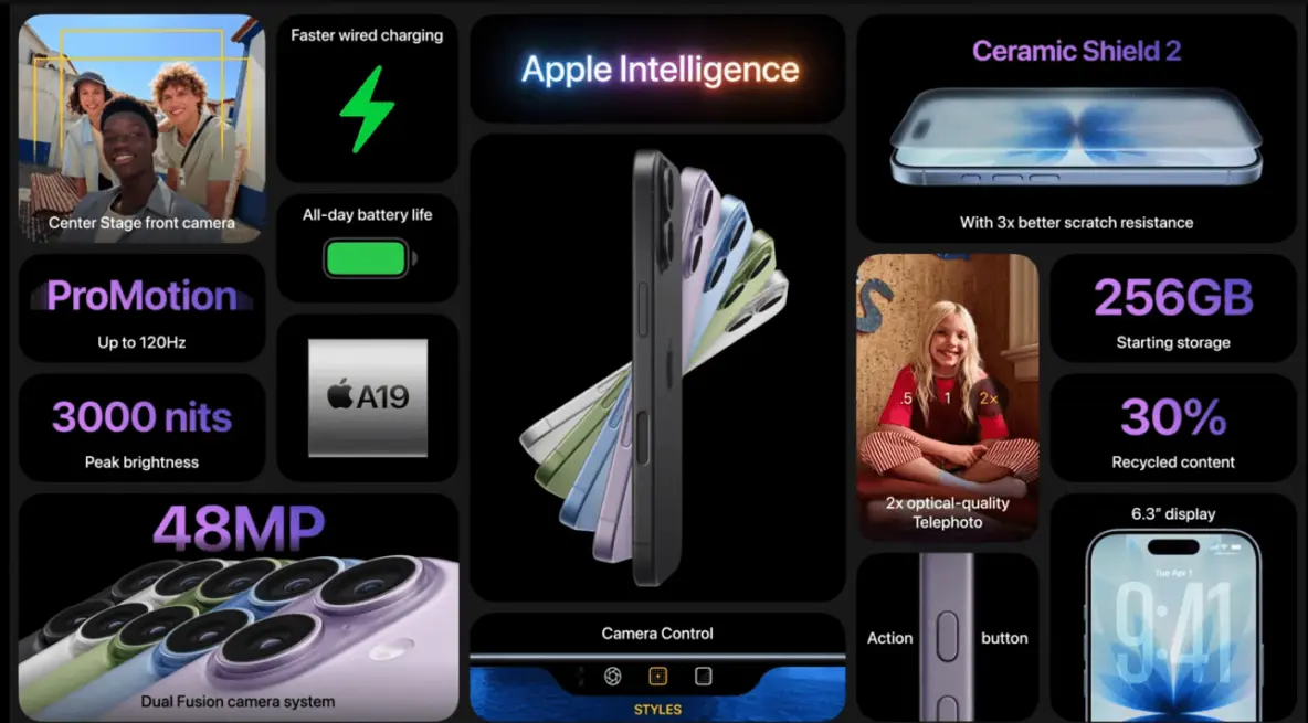 Smartfon otrzymał 6,3-calowy wyświetlacz i częstotliwość odświeżania ProMotion do 120 Hz. Maksymalna jasność wynosi do 3000 nitów. Ramki stały się cieńsze. Zmodernizowano szkło ochronne — zainstalowano Ceramic Shield 2, które trzy razy lepiej chroni przed zarysowaniami. Procesor — A19.