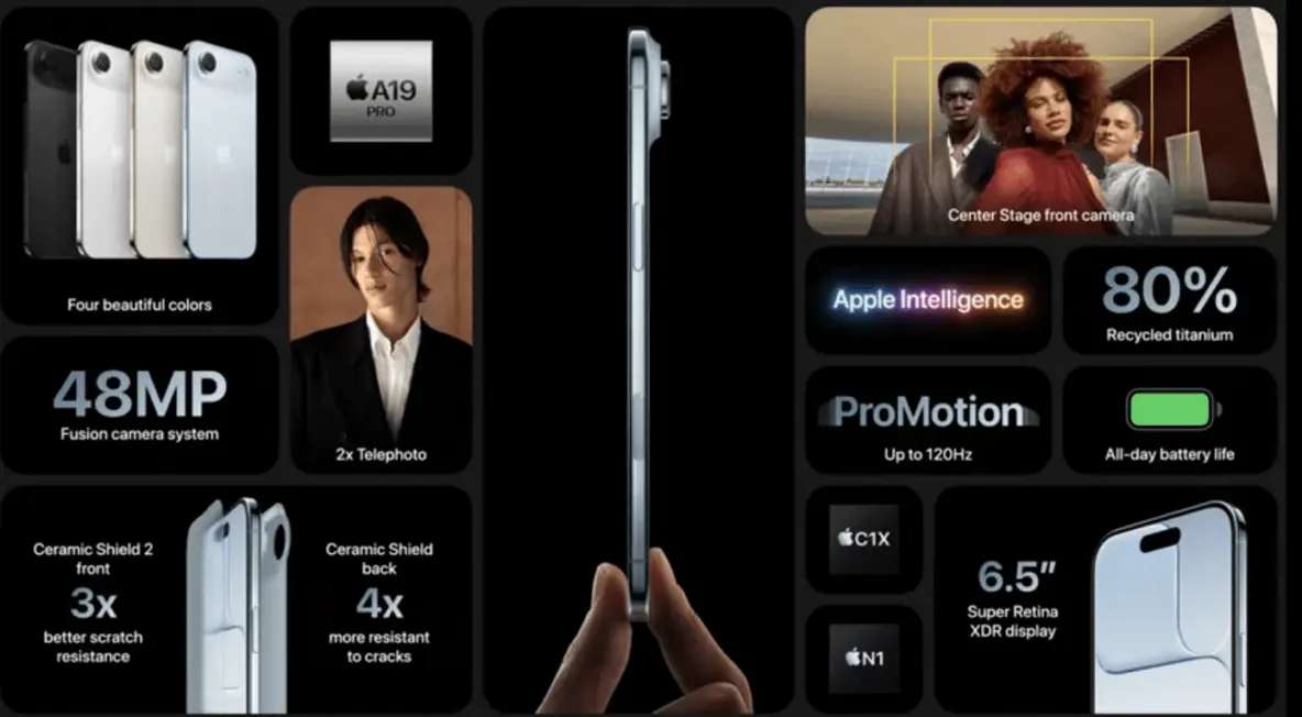 Chip — A19 Pro, „najmocniejszy” wśród smartfonów Apple. Po raz pierwszy w urządzeniu zainstalowano chip N1, który obsługuje Wi-Fi 7, Bluetooth 6 i protokół Thread.