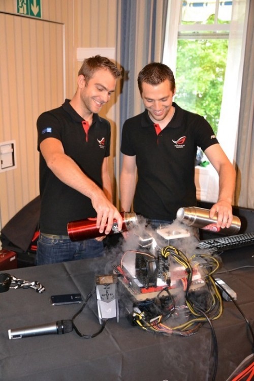 Dwóch francuskich overclockerów – StrategosSan i Wizerty – osiągnęło rekordowy wynik w benchmarku 3DMark Fire Strike Extreme, wynoszący 16 872 punktów. W platformie wykorzystali kartę graficzną ASUS ROG Matrix GTX 980 i płytę główną ASUS Rampage V Extreme.