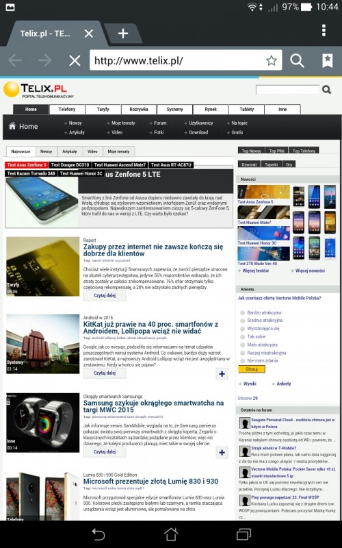 Karta sieciowa WiFi 802.11a/b/g/n działa wręcz idealnie. Wyszukuje sygnał sieci domowej poza budynkiem, czy kondygnację wyżej, więc można swobodnie korzystać z sieci domowej nawet wylegując się na leżaku, czy kocu na podwórku (oczywiście nie o tej porze roku :). Sygnał wyszukany jest po kilku sekundach i urządzenie błyskawicznie łączy się z siecią. Nie zaobserwowałem podczas testów zrywania połączenia. Strony otwierają się błyskawicznie a treści ładowane bardzo szybko. Jeżeli jesteśmy już przy przeglądaniu Internetu to również serfując po Internecie poprzez sieć komórkową, dzięki dostępowi LTE będzie przyjemnością.