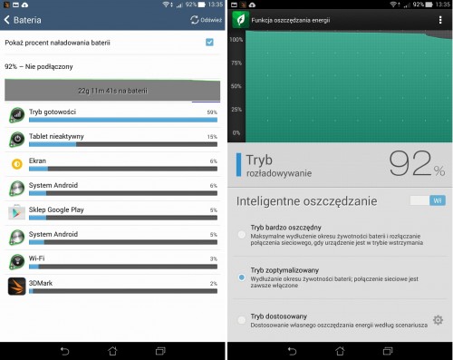 Wbudowany akumulator litowo-polimerowy o pojemności 3950mAh ładuje się do pełna przez przeszło 4 godziny. Pełne naładowanie pozwala na 4 godziny oglądania filmów przy ustawionej maksymalnej jasności lub 5 godzin przeglądania Internetu. Przy zmniejszeniu jasności wyświetlacza filmy będziemy mogli oglądać prze 7 godzin i tyle samo przeglądać strony internetowe. Przy aktywnej karcie SIM (kilka rozmów i sms dziennie) włączonej karcie sieciowej, sporadycznym, przeglądaniu Internetu i jasności wyświetlacza ustawionej na automatyczny urządzenie wytrzymało spokojnie przez pełne 3 dni co może być dobrym wynikiem. Urządzenie może wytrzymać w trybie czuwania przez tydzień.