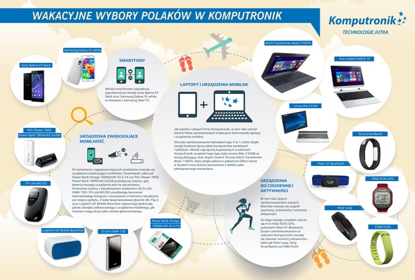 Jak wynika z danych firmy Komputronik, w tym roku wśród letnich hitów sprzedażowych tradycyjnie dominowały laptopy i urządzenia mobilne. Wśród smartfonów największą popularnością cieszyły Sony Xperia Z2 black oraz Samsung Galaxy S5 white w zestawie z Samsung Gear Fit. Wzrosło również zainteresowanie hybrydami typu 2 w 1, które dzięki swojej budowie łączą zalety komputerów osobistych i tabletów. Wśród najczęściej kupowanych w salonach Komputronik urządzeń tego typu były Lenovo Miix 2 64GB ze stacją dokującą, Acer Aspire Switch 10 oraz ASUS Transformer Book T100TA, który dzięki pełnemu pakietowi Office Home & Student znosi bariery korzystania z tabletu jako pełnoprawnego komputera.