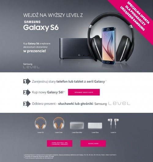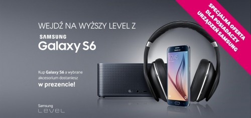 Od 28 maja br, przy zakupie najnowszego modelu smartfonu Samsung Galaxy S6, użytkownik może sam wybrać jako prezent jedno wybrane akcesorium – słuchawki lub głośniki Samsung Level, jeżeli wcześniej zarejestruje swój dotychczas używany aparat firmy Samsung.