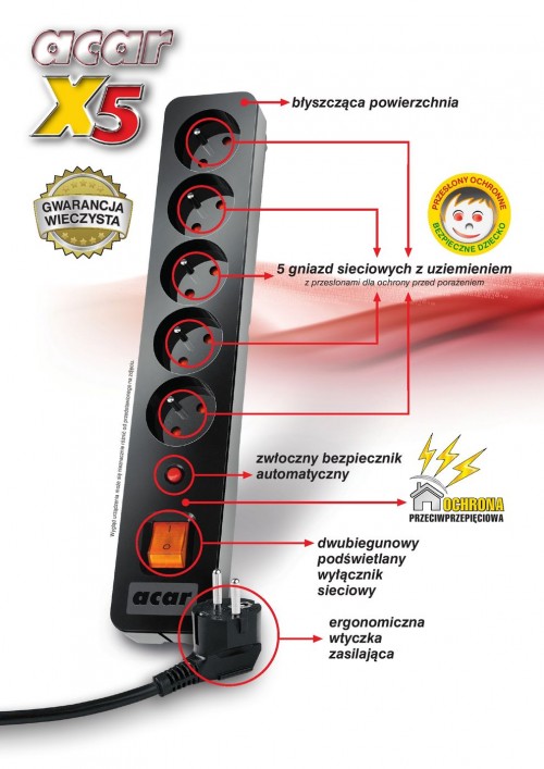 Dzięki wbudowanej ochronie przeciwprzepięciowej oraz automatycznemu bezpiecznikowi, użytkownik zyskuje skuteczną ochronę sprzętu przed jego uszkodzeniem. Dodatkowo listwa acar X5 została wyposażona w przesłony ochronne gniazd. Takie rozwiązanie zapobiega wetknięciu palców lub innych niedużych przedmiotów do otworów sieciowych, tym samym chroniąc dzieci i dorosłych przed przypadkowym porażeniem prądem elektrycznym.