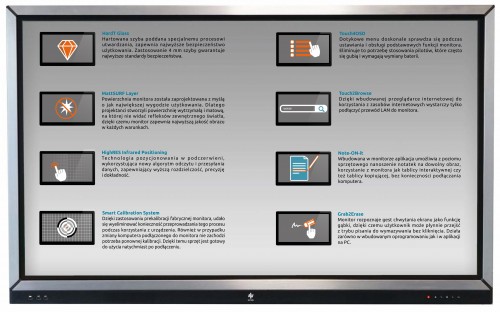 Monitor interaktywny to połączenie wysokiej klasy monitora LCD o rozdzielczości Full HD (lub UItra HD dla 84”) i podświetleniu LED z funkcją dotykową. Zastosowanie 4 mm, hartowanej szyby poddanej specjalnemu procesowi utwardzania gwarantuje najwyższe standardy bezpieczeństwa. Rama monitora została wykonana z aluminium najwyższej jakości a jej design dodaje nie tylko estetyki, ale i wzmacnia konstrukcję urządzenia, zwielokrotniając jego żywotność i bezpieczeństwo użytkowania. Matowa powierzchnia monitora eliminuje większość refleksów zewnętrznego światła, dzięki czemu monitor zapewnia doskonałą widoczność obrazu w każdych warunkach. Technologia pozycjonowania w podczerwieni wykorzystująca nowy algorytm odczytu i przesyłania danych, pozwala na wyższą rozdzielczość, precyzję i dokładność.