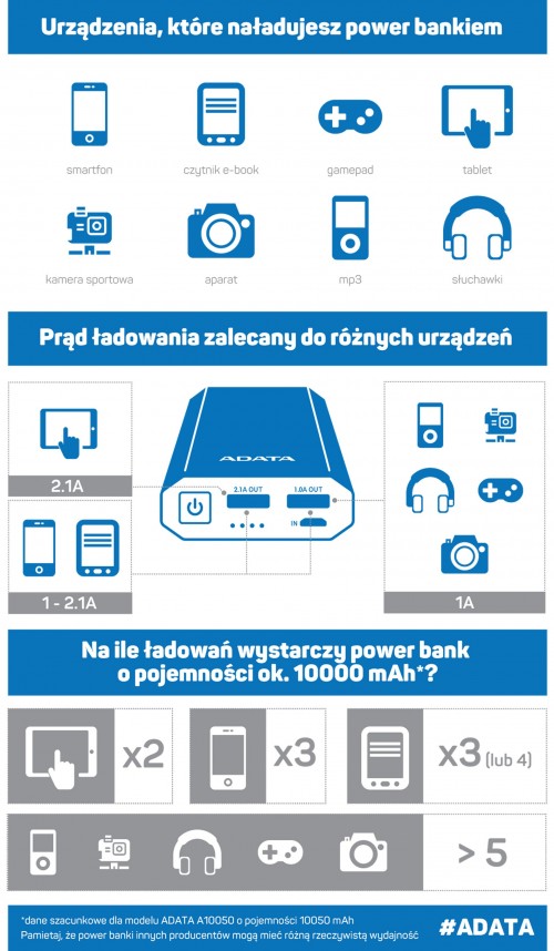 Jeśli jeden power bank ładuje smartfon prądem o natężeniu 1 A, a drugi oferuje 2 A, to postawienie komórki na nogi z użyciem tego drugiego będzie po prostu szybsze. Producenci tabletów wręcz zalecają ich ładowanie prądem o natężeniu 2 A. Ciekawe są power banki z dwoma gniazdami USB, gdzie użytkownik może wybrać dogodne dla danego urządzenie natężenie prądu, a w razie potrzeby podłączy jednocześnie smartfon i tablet. Takie power banki znajdziemy między innymi w ofercie firmy ADATA.