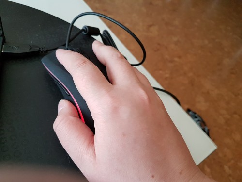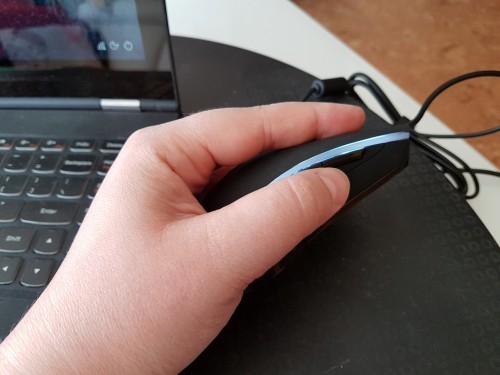 Mysz jest średniej wielkości i najwygodniejszym ułożeniem palców jest konfiguracja: 1+2+2. Jedyny dyskomfort jaki odczułam w takim ułożeniu przycisków, to dosyć częste niekontrolowane wciśniecie przycisku palcem serdecznym. Przycisk jest dokładnie umieszczony pod tym palcem i za bardzo nie można go inaczej ułożyć. Musiałam wyłączyć jeden przycisk – akurat był to przycisk „COFNIJ”. Częste powroty były bardzo frustrujące. Myślę, że przy dłuższym użytkowaniu można przywyknąć do takiego ułożenia i dodatkowych przycisków, ale jak na razie ciągle jeszcze w nie trafiam 😊