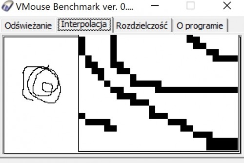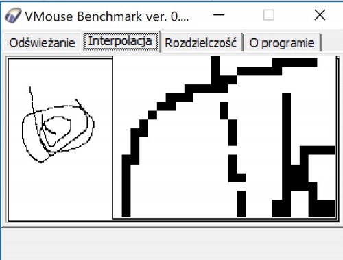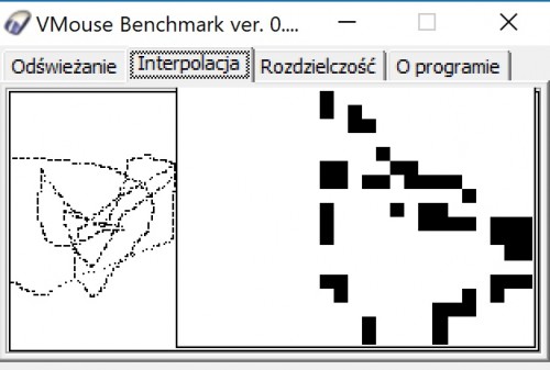- Test akceleracji wstecznej (Akceleracja wsteczna to skutek błędnej pracy myszy szybko albo wręcz gwałtownie przesuwanej, a przejawia się nagłym odskakiwaniem kursora lub jego bardzo wolną pracą.) – Przy niższych DPI jest praktycznie niezauważalna.