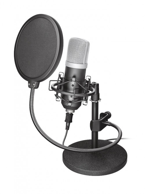Trust Emita to produkt, w którym wzorce zapisu kardioidalnego zapewniają precyzyjne nagrywanie brzmień wyłącznie z przodu mikrofonu, bez dźwięków w tle. Metalowy, ciężki stojak oraz statyczny uchwyt na mikrofon, zapobiegający jakimkolwiek wibracjom gwarantują stabilną pozycję urządzenia na każdej powierzchni. W sytuacji, gdy użytkownik uderzy przypadkowo w biurko, wstrząsy zostaną wyeliminowane i tym samym zupełnie niezauważalne na nagraniu.