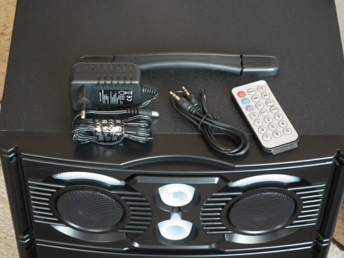 - Dodatkowe: kółka i wyciągany uchwyt walizkowy ułatwiające przenoszenie głośnika, iluminacja
