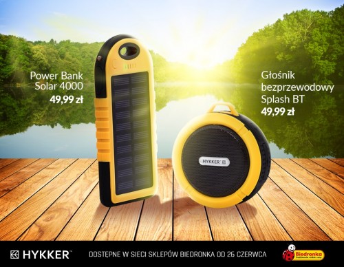 Już w najbliższy poniedziałek 26 czerwca w ofercie sklepów Biedronka pojawią się dwa urządzenia marki Hykker – Głośnik bezprzewodowy Splash BT i Power Bank Solar 4000. Każdy z produktów dostępny będzie w cenie 49,99 zł. Akcesoria sprawdzą się podczas wakacyjnych wyjazdów i weekendowych wypadów za miasto. Uprzyjemnią każdą chwilę spędzoną na świeżym powietrzu.