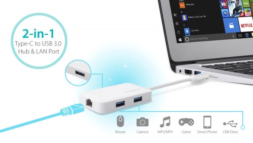 Adapter USB-C EU-4308 może przesyłać dane z różnymi urządzeniami z prędkością do 5 Gb / s. Umożliwia przesyłanie danych przez 3 porty USB 3.0 i dostęp do Internetu za pomocą portu Ethernet. UE-4308 jest rozwiązaniem dla najnowszych tabletów i ultrabooków, które są ograniczone do portów.