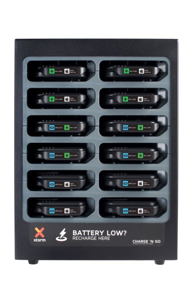 Xtorm Business Charge ‘n Go 12 – stacja ładująca z 12 kieszeniami, w których znajduje się 12 powerbanków (automatycznie ładowanych po umieszczeniu w stacji). Użytkownicy mogą wyją