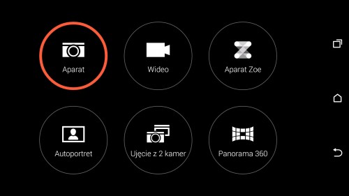 Interfejs jest prosty i przejrzysty. W prawym dolnym rogu znajduje się menu trybów, w którym możemy wybrać: Aparat, Wideo, Aparat Zoe, Autoportret (selfie), Ujęcie z 2 kamer oraz Panoramę 360. Od razu wyjaśnię, że aparat Zoe służy do robienia zdjęć seryjnych, które możemy zamienić w kilkusekundowe filmiki. Następnie do ich edycji służy specjalna aplikacja, dodająca różne filtry, efekty i muzykę i umożliwiająca podzielenie się klipami ze znajomymi. Ujęcie z 2 kamer to z kolei tryb, w którym na jednym zdjęciu, w małym okienku zostaje dodany obraz z drugiego aparatu (przedniego lub tylnego). To ciekawa, ale niezbyt przydatna funkcja.