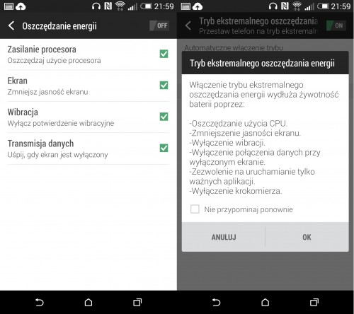 Bateria w One E8 to niewymienne ogniwo o pojemności 2600 mAh. Smartfon nie wybija się poza przeciętny czas pracy na baterii oferowany przez współczesne telefony, tzn. działa około 2 dni, a gdy go trochę przyciśniemy, trzeba będzie szukać ładowarki co wieczór. W kryzysowej sytuacji pomóc może włączenie trybu oszczędzania energii, w wersji podstawowej lub ekstremalnej.