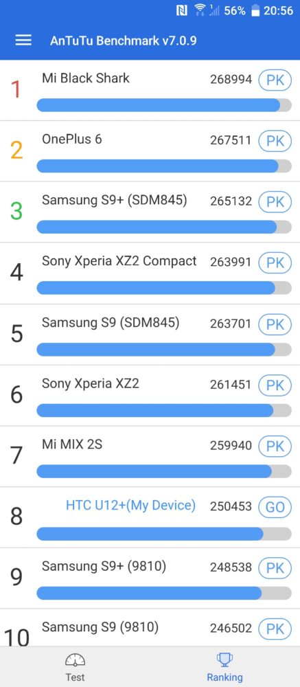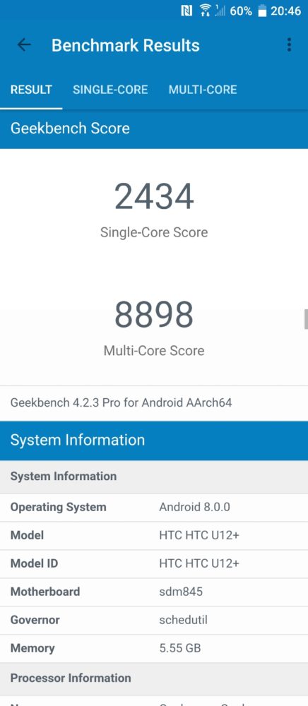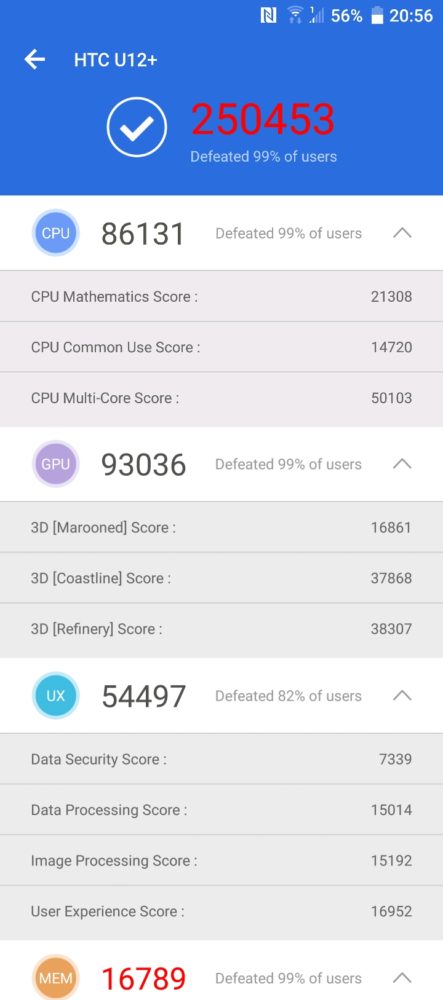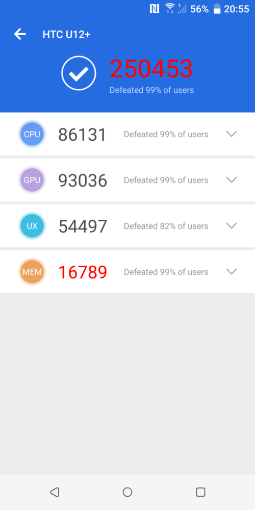Testowany smartfon Tajwańczyków, to nie tylko elegancka obudowa, ale również mocne podzespoły. Sercem HTC U12+ jest chipset Qualcomm Snapdragon 845 Mobile Platform z grafiką Qualcomm Adreno 630, 710 MHz. Dzięki 6GB pamięci RAM i 64GB pamięci na dane, HTC U12+ przekracza oczekiwania dotyczące wydajności smartfona. Smartfon działa naprawdę szybko, błyskawicznie reaguje na polecenia, aplikacje otwierają się szybko bez najmniejszych problemów. U12+ gotowy jest też na zastosowanie w VR i współpracę z Vive Focus. Benchmark AnTuTu, którego używam do testów wyświetlił ponad 250 tys. punktów. Dodam, że tylna część obudowy lubi być ciepła, przy pełnym obciążeniu. Poza tym mankamentem nie odnotowałem najmniejszych problemów ze stabilnością pracy smartfona.