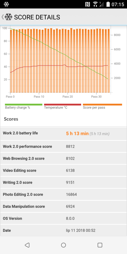 Oczywiście nie omieszkałem przeprowadzić standardowych testów w aplikacji PCMark, przy pełnej jasności ekranu, ubyło 80 % w ciągu 5 godzin i 13 minut. Co jest dobrym wynikiem i marzeniem chyba każdego posiadacza współczesnych smartfonów. Funkcja Quick Charge 3.0 umożliwia szybkie ładowanie rozładowanego akumulatora.