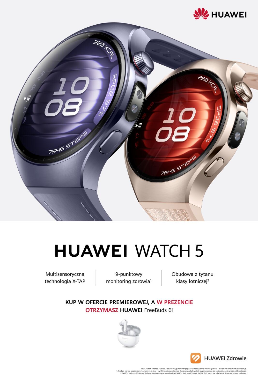 W okresie od 15 maja do 29 czerwca 2025 r., na huawei.pl oraz u Partnerów Biznesowych, wszystkie wersje HUAWEI WATCH 5 są dostępne w specjalnej ofercie premierowej, w ramach której pierwsi nabywcy otrzymają słuchawki HUAWEI FreeBuds 6i o wartości 399 zł w prezencie (lub za 1 zł).
