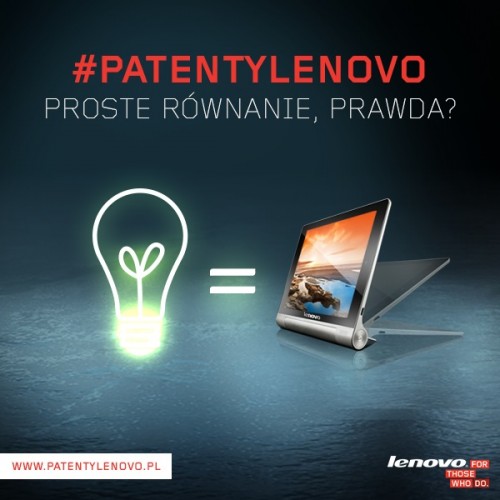 Właśnie wystartowała kampania „5 patentów z Lenovo”, w trakcie której marka zachęca do dzielenia się swoimi pomysłami na urozmaicenie codzienności w pięciu kategoriach: życie, moda, finanse, technologia oraz Lenovo Yoga Tablet. Pomysły można zgłaszać na stronie http://patentylenovo.pl. Akcja potrwa do 9 kwietnia.