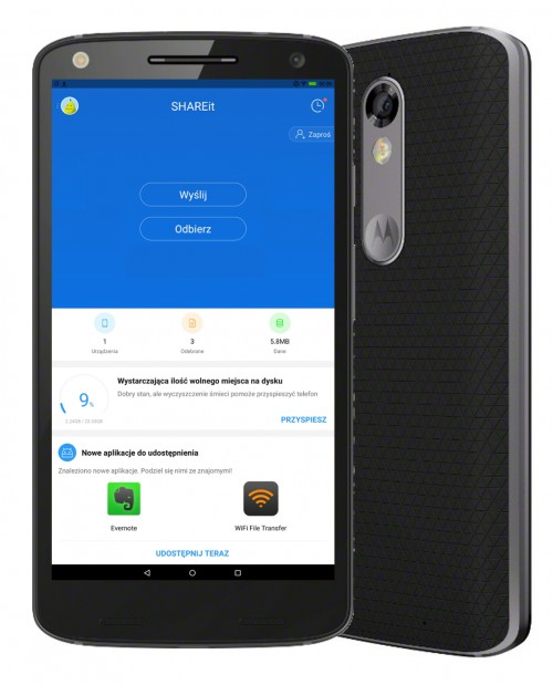 SHAREit to przykład fabrycznie zainstalowanej aplikacji Lenovo. Służy do przesyłania plików pomiędzy urządzeniami oraz do klonowania ustawień, kontaktów i aplikacji. Dzięki temu może sprawdzi się w codziennym korzystaniu, jak i podczas przywracania danych i ustawień po zmianie urządzenia na inne np. po wymianie laptopa na nowy. Aplikacja jest dostępna za darmo w sklepie Play Google. Aby w pełni wykorzystać jej możliwości, należy zainstalować ją na wszystkich urządzeniach, między którymi chce się wymieniać pliki. SHAREit działa bezprzewodowo dzięki sieci, a przysyłanie danych odbywa się poprzez zaznaczenie obiektów i komendy Wyślij-Odbierz.