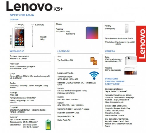 Nowy smartfon Lenovo został wyposażony w akumulator o pojemności aż 2750 mAh, który dzięki jednemu ładowaniu pozwoli nawet na 15 godzin rozmów przy korzystaniu z sieci 3G. Co istotne, bateria w Lenovo K5+ jest wymienna, dzięki czemu podczas wycieczek nie musisz szukać gniazdka, aby podłączyć do niego ładowarkę. W razie rozładowania akumulatora wystarczy jedynie wymienić go na drugi.