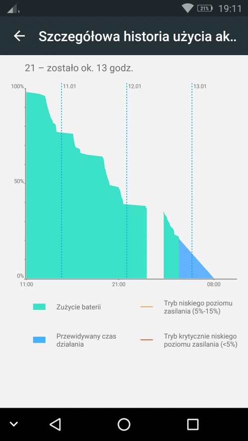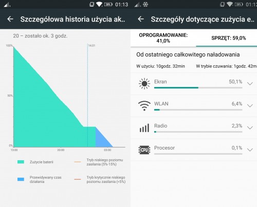 Według producenta smartfon działa do 72 godzin bez przerwy. Po dwóch tygodniach używania telefonu, jestem bardzo pozytywnie zaskoczony długością jego pracy na jednym ładowaniu. Akumulator zazwyczaj podpinałem po 3 dniach dość intensywnego użytkowania. Znajdą się zapewne ” hardkorowcy”, którzy bez ładowarki obędą się nawet tydzień. Pod tym względem telefon wypada dużo lepiej niż większość testowanych prze Telix.pl smartfonów. Na czuwaniu zużycie baterii jest znikome. Jak wspomniałem wcześniej smartfon wyposażony jest też w inteligentny system zarządzania energią, który pozwala na wydłużenie pracy urządzenia dzięki aktywowaniu Trybu Normalnego lub Trybu Ekstremalnego. Smartfon współpracuje z dołączoną do zestawu szybką ładowarką 24 W zapewniającą niemal 10 godzin działania baterii po zaledwie 15 minutach ładowania.