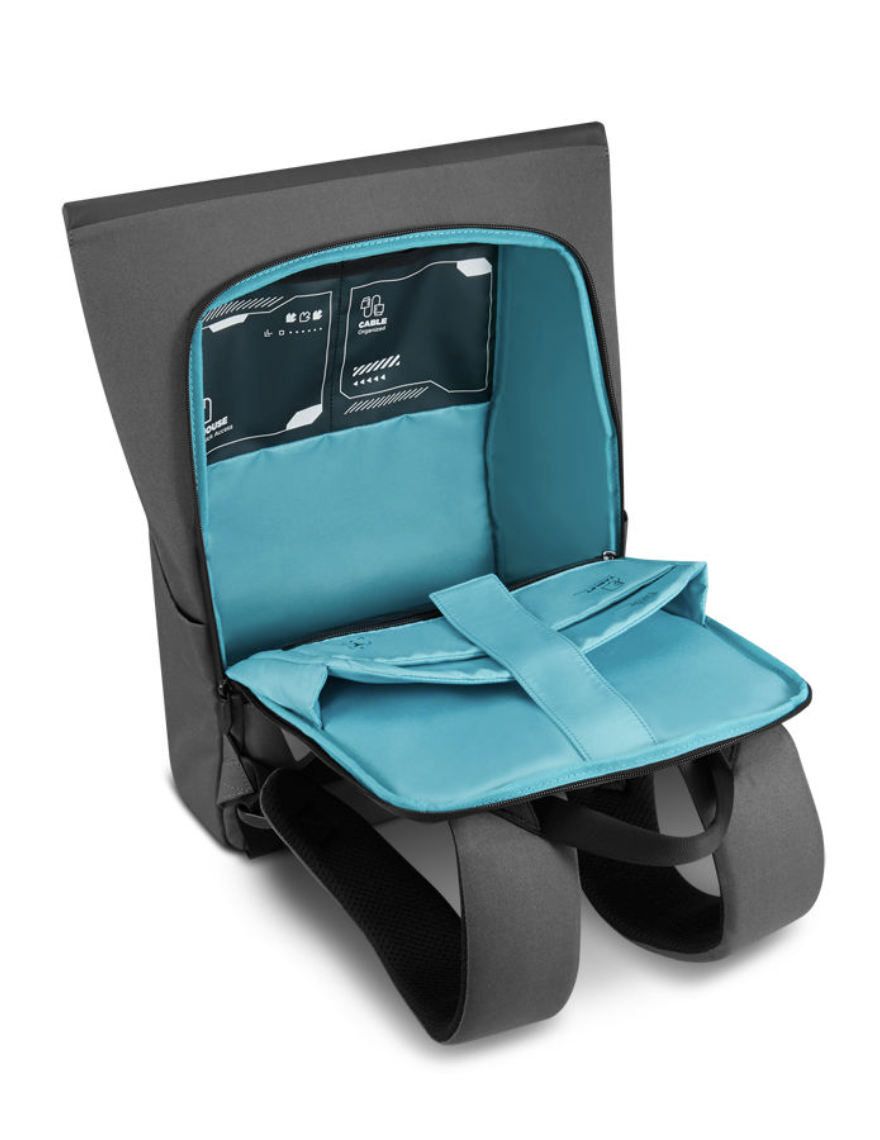 Wykonany z wysokiej jakości lekkich materiałów, w tym w 70% z materiałów zewnętrznych pochodzących z przetworzonego politereftalanu etylenu (PET), został zaprojektowany tak, aby zapewnić bezpieczeństwo i porządek laptopa i akcesoriów. Przestronna komora główna i dedykowana wyściełana komora pomieszczą laptopy o przekątnej do 16 cali. Cztery dodatkowe kieszenie pozwalają uporządkować najważniejsze rzeczy, a sprytny otwór na kabel umożliwia ładowanie w podróży4, a wygodny w podróży pasek bagażowy ułatwia transport.