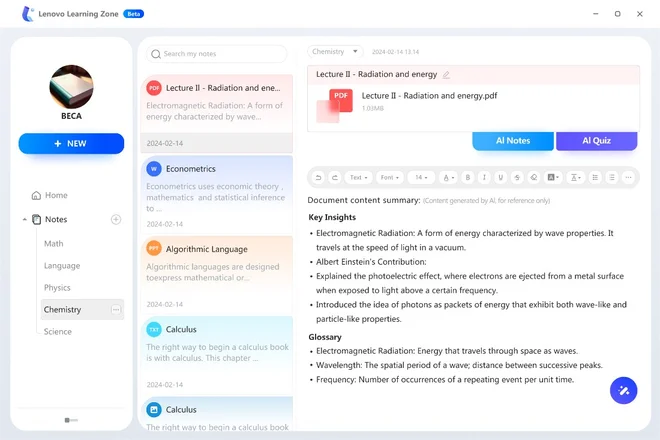 Lenovo Learning Zone to platforma edukacyjna oparta na sztucznej inteligencji, zaprojektowana w celu oferowania szerokiej gamy narzędzi ułatwiających naukę w klasie i poza nią10. Dzięki opartych na sztucznej inteligencji narzędziach, użytkownicy uzyskują wsparcie podczas zajęć stacjonarnych i funkcję transkrypcji w czasie rzeczywistym, dzięki czemu nigdy nie przegapią kluczowych szczegółów. Platforma przekształca materiały klasowe w notatki AI i wygenerowane przez AI quizy, generując spostrzeżenia i zapewniając wsparcie w nauce poprzez angażujące, spersonalizowane oceny.