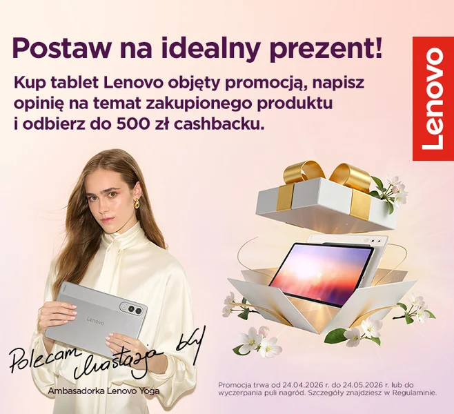 Wystarczy kupić w okresie od 24.04.2026 r. do 24.05.2026 r. tablet Lenovo objęty promocją i zachować dowód zakupu. Następnie w ciągu 21 dni kalendarzowych od daty zakupu klient musi wypełnić formularz zgłoszeniowy, a po pomyślnej weryfikacji i akceptacji zgłoszenia otrzyma wiadomość elektroniczną z formularzem, który upoważnia do otrzymania cashbacku. W ramach formularza zgłoszeniowego, klient może również podzielić się swoją opinią o zakupionym produkcie. Zostawienie opinii nie jest warunkiem koniecznym wzięcia udziału w promocji i nie wpływa na możliwość otrzymania cashbacku.