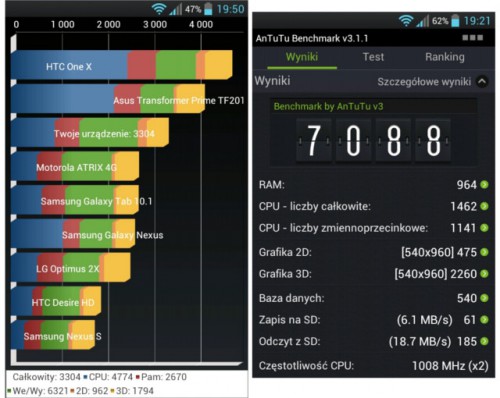 Kontekst motywujący mnie do napisania tego testu nakazuje dokonać porównania: Samsung Galaxy SIII osiąga w Quadrancie sporo powyżej 5000 punktów, w AnTuTu powyżej 15000, w Nenamark2 prawie 60 fps, a wynik w SunSpider przy użyciu standardowej przeglądarki Androida (Internet) mieści się w przedziale 1100 ? 1450 ms w zależności od źródła informacji.
