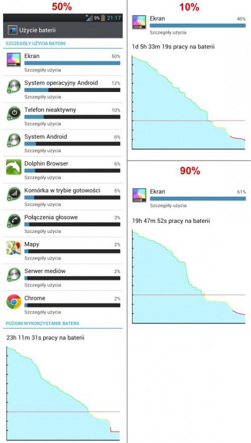 Pokusiłem się o sprawdzenie jaki wpływ na żywotność ogniwa może mieć zmiana stopnia podświetlenia ekranu. Punktem wyjścia było nieskrępowane, zgodne z nawykami użytkowanie telefonu przy połowicznej jasności wyświetlacza, doprowadzenie baterii do stanu 9% naładowania, a następnie zarejestrowanie udostępnianych przez system informacji o wykorzystaniu akumulatora przez poszczególne elementy. Następnie starałem się dwukrotnie powtórzyć całą procedurę przy podświetleniu kolejno: 10 i 90%, nadal traktując telefon w miarę możliwości swobodnie, ale tak by ostatecznie wylądować z maksymalnie zbliżonym do pierwowzoru łącznym czasem włączenia ekranu. Ścisłość wymaga oczywiście aby ten czas ujawnić: 2 godziny, 39 minut i 6 sekund. Dla większej przejrzystości posklejałem zrzuty ekranowe z pierwszego pomiaru, aby zobrazować dokładniej wkład systemu i aplikacji w uśmiercanie baterii, wyniki pozostałych pomiarów ograniczam jedynie do fragmentów ujawniających żarłoczność wyświetlacza oraz do wykresów pokazujących przebieg i czas rozładowania, jako że udziały pozostałych elementów były bardzo zbliżone do pierwotnego ? jedynie proporcjonalnie zwiększone lub zmniejszone.