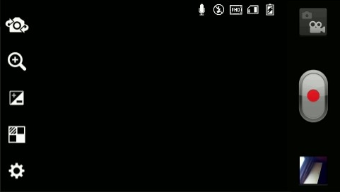 Po przejściu do rejestracji filmów ikona aktywacji głosowej zmienia się w ikonę regulacji zbliżenia cyfrowego, a ikona wyboru trybu zdjęcia ? w ikonę wyboru efektów specjalnych. Po uruchomieniu zapisu, przełącznik zdjęcie-film znika, a jego miejsce zajmuje przycisk umożliwiający rejestrację w locie wybranych klatek.