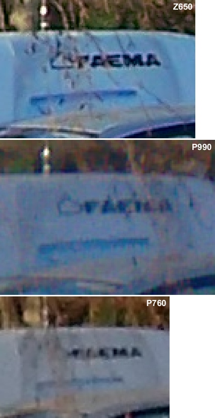 P990 szumi jak stara, zakurzona winylowa płyta, a jego najdokładniejsza spośród całej trójki matryca nie pomaga w uchwyceniu szczegółów, część z których zresztą całkowicie ginie w zagadkowy sposób. P760 wszystkie detale ma wyprane, ale przynajmniej równomiernie, a „piach” jest prawie niezauważalny. Jednoczesny brak szczegółów i szumu może rodzić podejrzenie o zastosowanie silnych algorytmów oczyszczających obraz. W tym wypadku ?dziadek? Z650 z czytelnym napisem, pięknie zarysowanymi krawędziami dachów samochodów i minimalnym szumem (nie liczymy artefaktów JPG w pobliżu kontrastowych krawędzi!) zostawia młodszych konkurentów daleko z tyłu. Żeby jednak nie wpadł w zbytnie samozadowolenie, zdradzę że w słabym świetle radzi sobie równie kiepsko jak oni, szumiąc niemiłosiernie, mimo że najprawdopodobniej ma przetwornik o sporo większych rozmiarach.