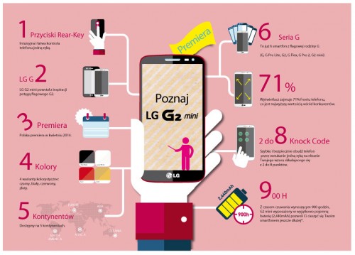 Najnowszy LG G2 mini ma zapewnić równowagę między nowoczesnym wzornictwem, a funkcjonalnością, przy kompaktowych wymiarach i bezkompromisowej wydajności. W smartfonie zastosowano podzespoły najwyższej klasy, aby zapewnić również doskonałą wielozadaniowość urządzenia, m.in. baterię o pojemności 2440 mAh gwarantującą żywotność przez cały dzień; 4,7-calowy wyświetlacz IPS odzwierciedlający żywy i dynamiczny obraz oraz wydajny czterordzeniowy procesor.