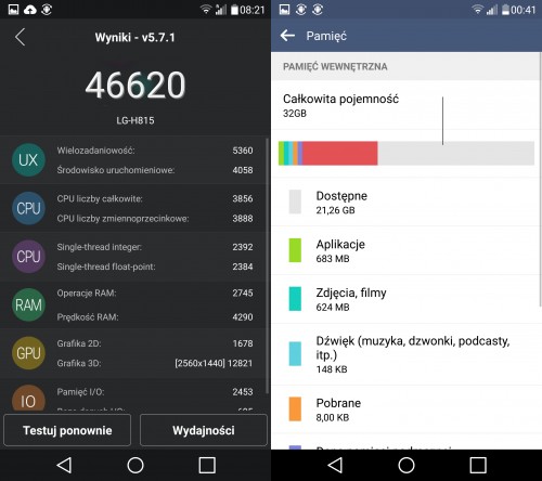 Telefon posiada 32 GB wbudowanej pamięci, z czego dla użytkownika pozostaje ok. 21,5 GB. Na szczęście smartfon pozytywnie wyróżnia się na tle konkurencji obecnością slotu na karty microSD, zatem pamięć bez problemu możemy rozszerzyć o kolejne 128 GB.