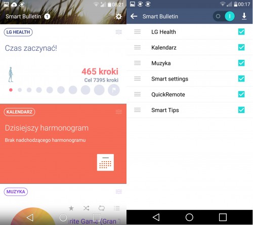 Po lewej stronie od ekranu domowego znajduje się ekran o nazwie Smart Bulletin, czyli miejsce, w którym LG wyświetla różne informacje dotyczące naszego telefonu. Chodzi np. o dane z aplikacji LG Health, wpisy z kalendarza, ostatnio odtwarzaną muzykę, czy skrót do inteligentnych ustawień. Jeśli ktoś tego nie potrzebuje, ekran można wyłączyć.