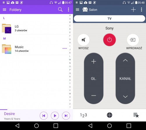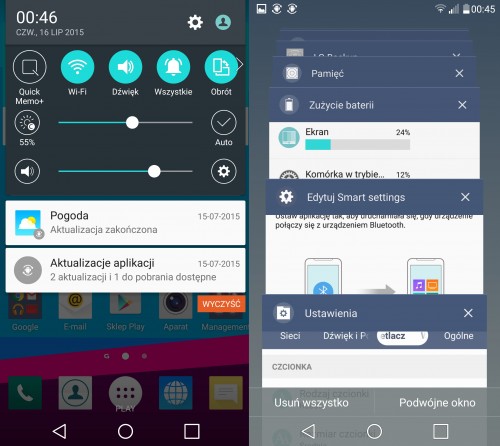 Centrum powiadomień, w górnej części, zawiera skróty do najczęściej używanych funkcji telefonu, które możemy przewijać w poziomie i dowolnie edytować. Poniżej znajdują się suwaki regulacji jasności ekranu oraz głośności. Otwarte aplikacje, standardowo dla Lollipopa, wyświetlane są w formie karuzeli. Na szczęście, w odróżnieniu od czystego Androida, mamy tutaj przycisk pozwalający na zamknięcie wszystkich aplikacji naraz.