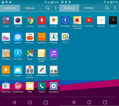 Jeśli mowa o aplikacjach, sprawdźmy, jakie programy przygotowało dla nas LG. Zasobnik został podzielony, tak jak w starszych wersjach Androida, na zakładkę Aplikacje oraz Widżety. Na szczęście coraz więcej producentów nie przytłacza nas mnóstwem zainstalowanych programów, lecz stawia na minimalizm i wolny wybór. Tak postąpiło również LG, oferując skromny zestaw potrzebnych i ciekawych apek.