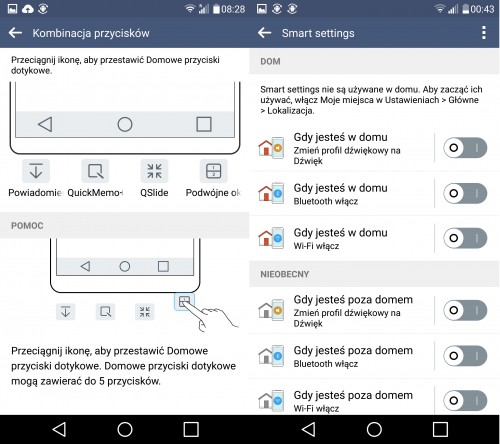 Nakładka od LG pozwala na wiele – m. in. na edycję przycisków systemowych Androida czy ustawienie powiadomień, które mogą być blokowane dla konkretnej aplikacji. Jesteśmy w stanie również zaprogramować określone funkcje smartfona w taki sposób, by włączały lub wyłączały się w chwili naszej obecności w domu lub poza domem. Mowa m. in. o modułach Bluetoth oraz Wi-Fi, a także zmianie profilu dźwiękowego.