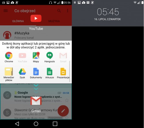 Zdecydowanie przydaje się funkcja dzielenia ekranu na 2 aplikacje pracujące jednocześnie. Przy 5,5-calowym wyświetlaczu rozwiązanie to jest wygodne i praktyczne. Rozmiar okien możemy oczywiście regulować. Inną ciekawostką jest , ale możliwość wyświetlenia daty i godziny na pasku wysuwanym od góry ekranu, przy zablokowanym telefonie. Wystarczy przeciągnąć palcem od górnej krawędzi i przytrzymać. Gdy puścimy palec, ekran ponownie się zablokuje.