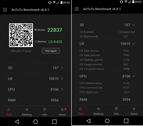 LG K10 LTE to nie demon wydajności, ale nie jest to również flagowiec z najwyższej półki cenowej. Ale system działa sprawnie i nie użytkownik nie musi się obawiać, że telefon dostanie nagle czkawki. Mechanicznym sercem telefonu jest czterordzeniowy procesor Qualcomm Snapdragon 410 (MSM8916), z zegarem 1.2 GHz (Cortex-A53), który wspomaga 1,5 GB pamięci RAM i układ graficzny Adreno 306. Warto wspomnieć o pamięci, której zostaje niespełna 10 GB z 16 wbudowanych w urządzenie.