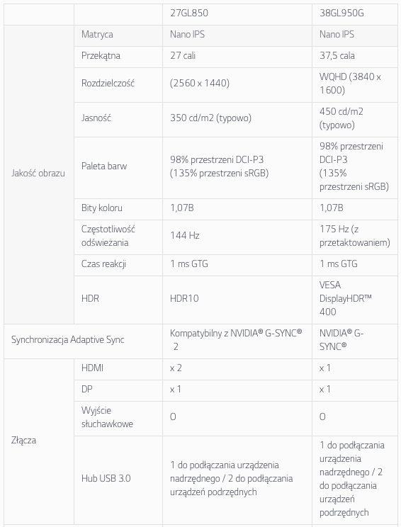 27-calowy monitor UltraGearTM jest kompatybilny z technologią NVIDIA® G-SYNC2 oraz obsługuje format HDR10, natomiast 38-calowy model współpracuje z procesorem NVIDIA G-SYNC, posiada certyfikat VESA DisplayHDR™ 400 oraz został poddany przez firmę NVIDIA ponad 300 testom jakości obrazu i wydajności, gwarantujących najwyższy poziom satysfakcji z gier. Oba monitory zapewniają płynne odwzorowanie ruchu bez zacinania lub rozrywania obrazu, a także są wyposażone w specjalne funkcje gamingowe, takie jak Dynamic Action Sync, stabilizator czerni Black Stabilizer oraz celownik Crosshair, przydatne szczególnie w grach FPS.